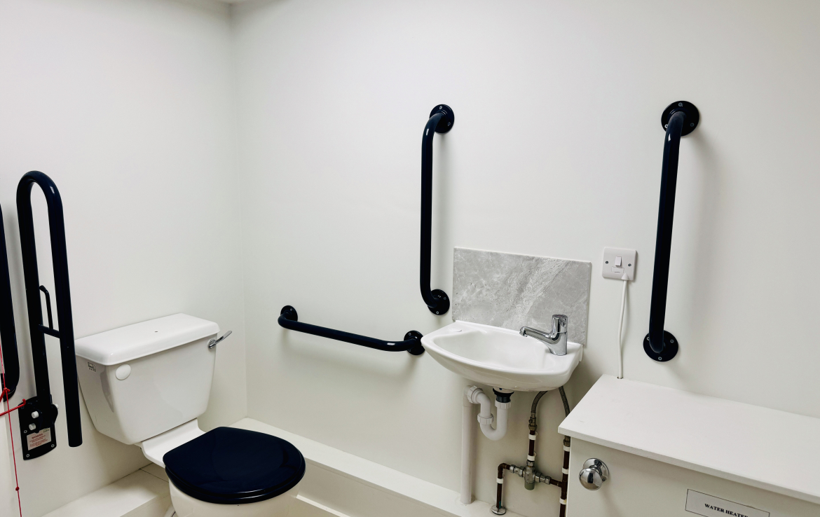 The rear includes a kitchen with sink, worktop and base cabinets, a separate storage cupboard, and a WC with disabled provision, served by an electric water heater.